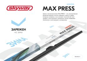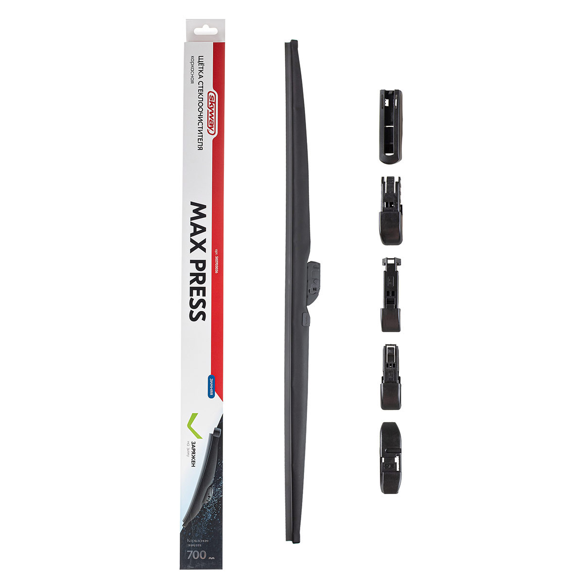 Щетка стеклоочистителя каркасная зимняя SKYWAY MAX PRESS 6 адаптеров в коробке 70 см/28" - обеспечивает плавное и легкое скольжение щеток благодаря графитовому напылению. Все подвижные элементы защищены резиновым кожухом, идеальны для суровых условий.
